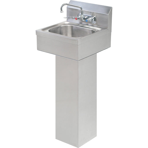 Hand Sink, pedestal base, 14"W x 10" front-to-back x 5" deep bowl, 8" backsplash, 4" centers for splash mount faucet (included), 6" apron, 1-1/2" drain opening, 20/300 stainless steel, includes mounting bracket & clips with hardware