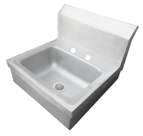 Hand Sink, wall mounted, 14"W x 10" front-to-back x 5" deep bowl, (2) holes for 4" center deck-mount faucet (not included), 8" backsplash, 6" apron, 1-1/2" drain opening, includes mounting bracket & clip with hardware, 20/300 stainless steel, NSF, Made in USA