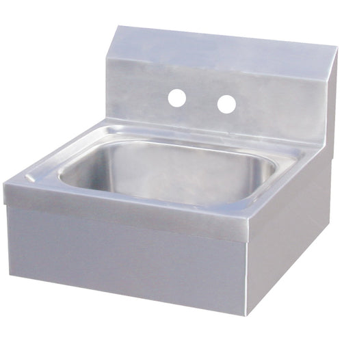 Hand Sink, wall mounted, 14"W x 10" front-to-back x 5" deep bowl, (2) holes for 4" center splash-mounted faucet (not included), 8" backsplash, 6" apron, 1-1/2" drain opening, includes mounting bracket & clip with hardware, 20/300 stainless steel, NSF, Made in USA