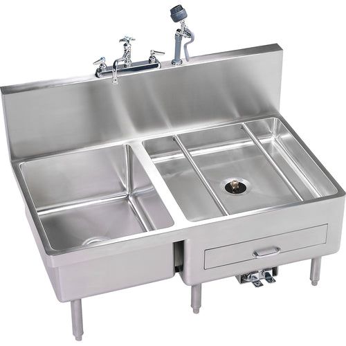 Combo Sink & Utensil/Can Washer, 16 gauge #304 stainless steel construction., one piece wash basin, 1" OD stainless steel tubing wash supports, fully welded, removable. scrap drawer, integr.12" backsplash, double foot pedal valve, return-mounted faucet, with 48" flexible stainless steel hose & spray head