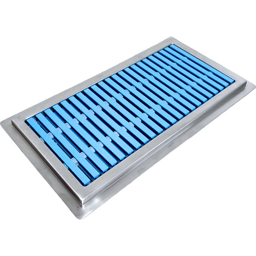 FT Floor Trough, 36"W x 18"D, 4" deep receptacle, (1) 6-1/2" waste outlet with perforated waste basket & 4" OD tailpiece, includes anchor straps, 14/304 stainless steel construction, brushed satin finish, (PFG-ADA) pultruded fiberglass grating, blue, NSF, Made in USA
