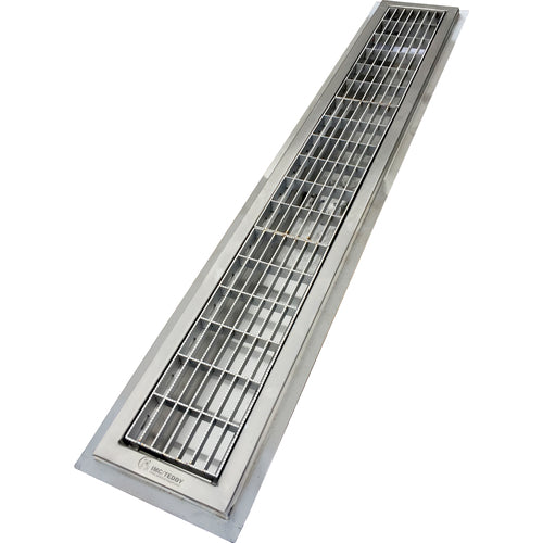 FWR Floor Water Receptacle, 60"W x 7-1/2"D, 4" deep receptacle, (1) 4" OD tailpiece, stainless steel beehive strainer, 16/304 stainless steel construction, brushed satin finish, (SQ) grid grating, NSF, Made in USA