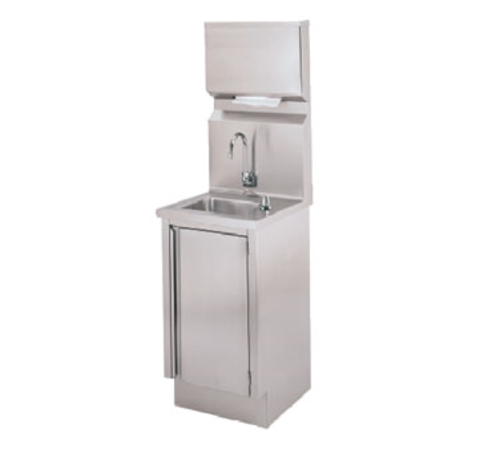 HS-SEC Security Hand Sink, free standing, 19-1/4"W, 20-1/2" front-to-back, 16/304 stainless steel, 16-3/4" backsplash, non-drip marine edges, 16 gauge stainless steel body with removable front panel, splash-mounted gooseneck faucet with lever handles, stainless steel soap dispenser