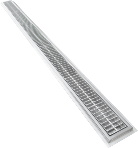 NWR Floor Water Receptacle, 36"W x 6"D, 4" deep receptacle, (1) 3" OD tailpiece, stainless steel beehive strainer, 16/304 stainless steel construction, brushed satin finish, (SQ) grid grating, NSF, Made in USA