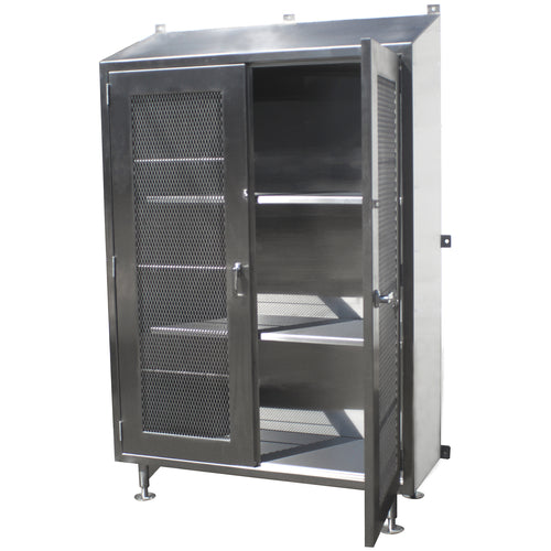 Security Cabinet, 18GA type 304 stainless steel, sloped top, (3) 18GA fixed shelves, hooks for special tools, 2" square wall bracket to secure unit to wall, (2) 18GA double pan doors, pull handle, key lock, 6" stainless steel legs with flanged feet