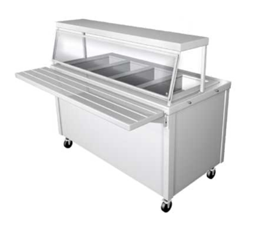Sandwich Counter with Refrigerated Base, self-contained, with an insulated door, (3) pans, 50"W x 30-1/2"D x 36"H, holds cold food between 33° - 41°F, mobile modular, enclosed cabinet base, 16 gauge stainless steel top, 14 gauge stainless steel frame, 5"H heavy duty double bearing swivel casters, (2) casters to be fitted with brakes, 6' cord & plug, 1/4 HP, 120V, 7.0amps, 5-15P