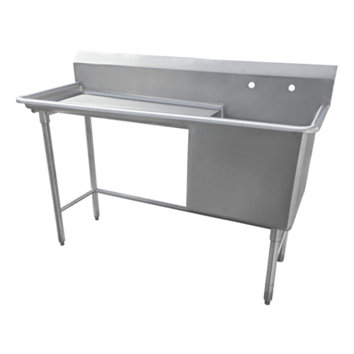 Scullery Sink, one compartment, 59"W x 24"D x 44"H overall size, (1) 20"W x 20" front-to-back x 14" deep compartment, (1) 36" left drainboard, 10"H backsplash, top & sink bowls have 3/4" coved radius, 3-1/2" drain opening, 14/300 stainless steel construction, 16 gauge stainless steel legs & gussets, adjustable feet, Made in USA