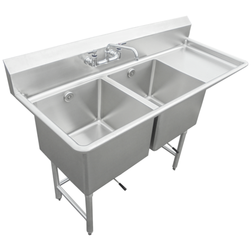 Scullery Sink, two compartment, 68"W x 32"D x 44"H overall size, (2) 20"W x 28" front-to-back x 14" deep compartments, (1) 24" right drainboard, 10"H backsplash, top & sink bowls have 3/4" coved radius, 3-1/2" drain openings, 16/300 stainless steel construction, 16 gauge stainless steel legs & gussets, adjustable feet, Made in USA