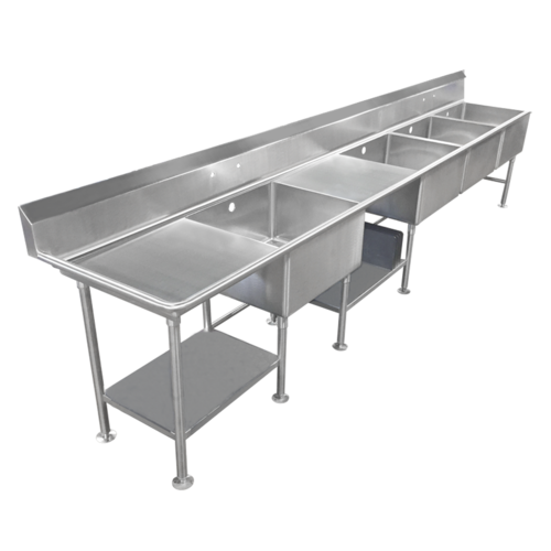Scullery Sink, four compartment, 126"W x 32"D x 44"H overall size, (4) 20"W x 28" front-to-back x 14" deep compartments, (1) 36" left drainboard, 10"H backsplash, top & sink bowls have 3/4" coved radius, 3-1/2" drain openings, 14/300 stainless steel construction, 16 gauge stainless steel legs & gussets, adjustable feet, Made in USA