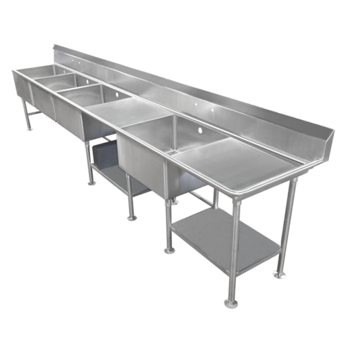 Scullery Sink, four compartment, 130"W x 28"D x 44"H overall size, (4) 24"W x 24" front-to-back x 14" deep compartments, (1) 24" right drainboard, 10"H backsplash, top & sink bowls have 3/4" coved radius, 3-1/2" drain openings, 14/300 stainless steel construction, 16 gauge stainless steel legs & gussets, adjustable feet, Made in USA