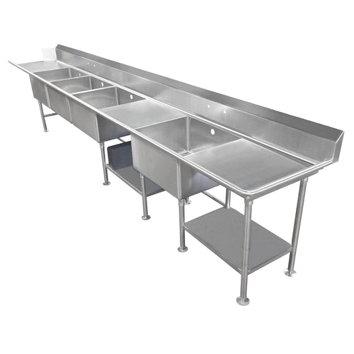 Scullery Sink, four compartment, 153"W x 28"D x 44"H overall size, (4) 24"W x 24" front-to-back x 14" deep compartments, (2) 24" left & right drainboards, 10"H backsplash, top & sink bowls have 3/4" coved radius, 3-1/2" drain openings, 14/300 stainless steel construction, 16 gauge stainless steel legs & gussets, adjustable feet, Made in USA