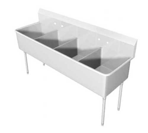 Scullery Sink, four compartment, 102"W x 28"D x 44"H overall size, (4) 24"W x 24" front-to-back x 14" deep compartments, 10"H backsplash, top & sink bowls have 3/4" coved radius, 3-1/2" drain openings, 14/300 stainless steel construction, 16 gauge stainless steel legs & gussets, adjustable feet, Made in USA