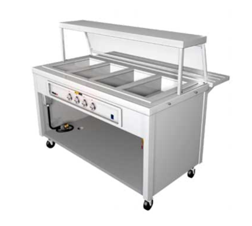 Hot Food Counter, electric, (6) hot food wells, 1200 watt element for each well, 92"W x 30-1/2"W x 36"H, mobile modular, open cabinet base, control thermostat with an "off position", pilot light & 5' long cord, 16 gauge stainless steel top, 14 gauge stainless steel frame, 5"H heavy duty double ball bearing swivel casters, (2) casters to be fitted with brakes, 208v/3-ph, 7200w, 20.0amps, UL, NSF