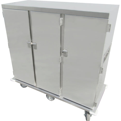 Tray Delivery Cart, insulated, heavy duty, (27) 15" x 20" or 14" x 18" tray capacity with 5" spacing (1 tray per slide), removable tray slides & (3) hinged doors, push handle, 18 gauge all welded stainless steel, brushed satin finish, continuous bumper, swivel casters