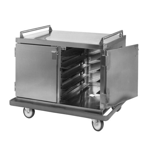 Tray Delivery Cart, insulated, heavy duty, (20) 15" x 20" or 14" x 18" tray capacity with 5" spacing (2 trays per slide), removable tray slides & (2) hinged doors, push handle, 18 gauge all welded stainless steel, brushed satin finish, continuous bumper, swivel casters