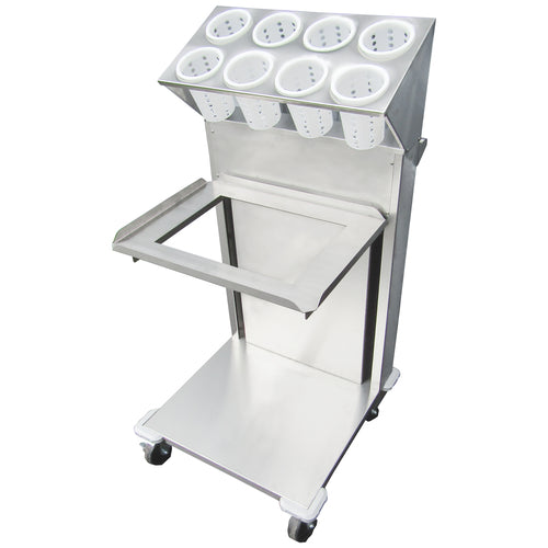 Tray Dispenser, 24"W x 24"D x 36"H, holds 14" x 18" plastic trays, spring maintained dispensing height, corner bumpers, 16/304 stainless steel construction, 5" casters (2 with brakes), NSF, Made in USA