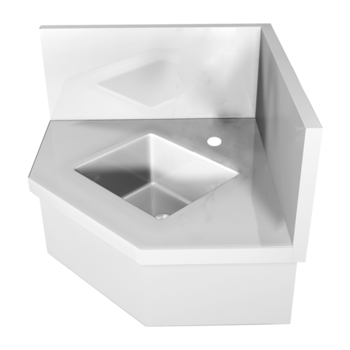WS Corner Hand Sink, wall mounted, 16/304 stainless steel, integrated backsplash, non-drip marine edges, 14 gauge stainless steel front apron with rear flange & "Z" strip, 1-hole deck gooseneck faucet with wrist action handles & stainless steel soap dispenser, Made in USA