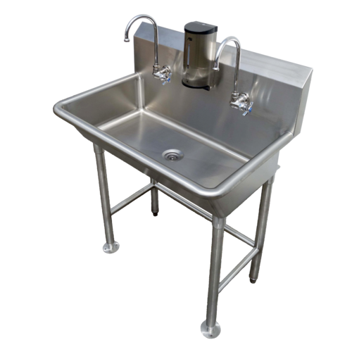 Multi-Station Hand Wash Sink, wall mount, 98" wide x 18" front-to-back x 7" deep compartment, 10" H backsplash, (4) splash mount gooseneck faucets, 1-1/2" rolled edge on front & sides, includes "Z" clips & 12-gauge stainless steel brackets, 16/304 stainless steel construction, NSF