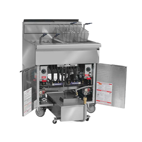 Fryer, gas, floor model, (6) battery, 75lb. capacity each, built in space saver filter system, 5.5 GPM roller pump, computer controls, includes: joiner strips & filter starter kit, stainless steel frypot, front & sides, casters, 120v/60/1-ph, 6.8 amps, 1/3 HP, 1,050,000 BTU, CSA Flame, CSA Star, NSF, CE