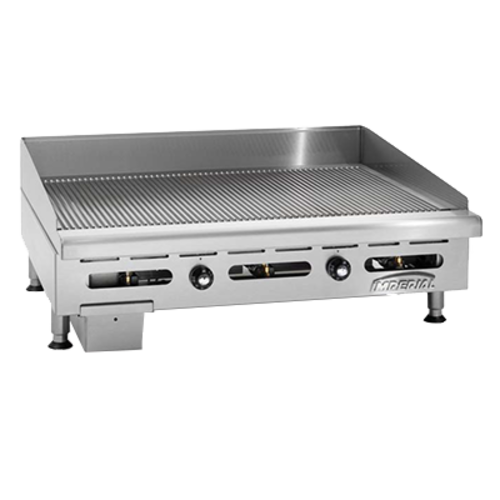 Griddle, countertop, gas, 72" W x 24" D cooking surface, 1" thick, grooved plate, thermostatic controls, 4" wide grease gutter, removable grease can, stainless steel front, sides, splash guard & ledge, 4" legs, 180,000 BTU, cETLus, NSF, CE