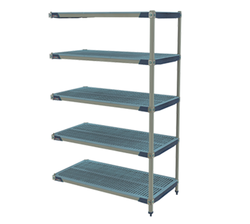 MetroMax® i Add-On Shelving Unit, 72"W x 18"D x 74"H, rust proof, 750 lb capacity per shelf, 2000 lb. capacity per unit, includes: (5) open grid polymer shelves with reinforced type 304 stainless steel corners and removable polymer shelf mats, bag of (4) wedge connectors included with each shelf, (2) polymer posts & (10) "S"Hooks for an end-to-end configuration, Microban antimicrobial product protection, KD, NSF