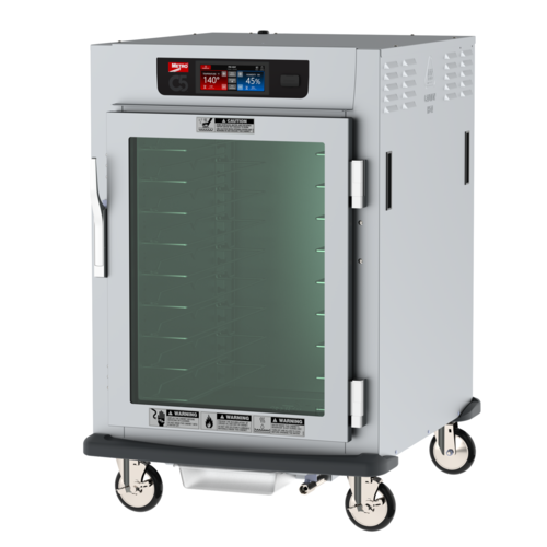 C5™ 9 Series Controlled Humidity Heated Holding and Proofing Cabinet with 6.8" touch-screen controls, mobile, 1/2 height, pass thru, (1) glass & (1) solid doors, universal wire slides, capacity (8) 18" x 26" or (16) 12" x 20" x 2-1/2" pans, 3" O.C. (adjustable on 1-1/2" increments), stainless steel, 5" casters, polymer bumper & drip trough combination, 120v/60/1-ph, 2000 watts, 16.7 amps, NEMA 5-20P, cULus, NSF, Made in USA
