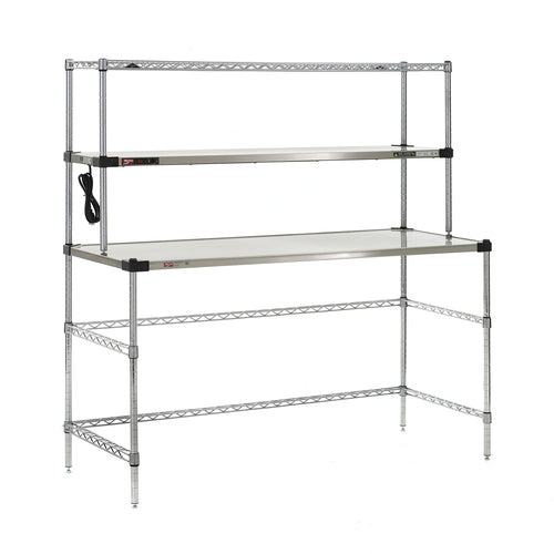 Super Erecta® Workstation with Hot Open Heated Shelf, 3-sided open base, 60"W x 24"D stainless steel work surface, (1) 60"W x 14"D heated shelf, adjustable thermostat to 200°F max temperature, (1) overhead wire shelf, chrome plated wire & posts, 120v/60/1-ph, 600 watts, 5.0 amps, cord & NEMA 5-15P, NSF, cULus, Made in USA