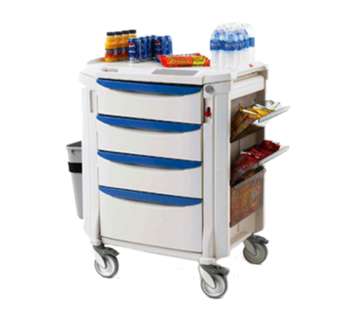 Mini Bar Restocking Cart, high profile, with (3) 6"Drawers (1) 9"Drawer, wastebasket (4) tilt-out bins (1) divider kit for 6"/9"Drawer, key lock on right side (4) 5"Dia. casters (2) with brakes, polymer construction with Microban® Antimicrobial Product Protection