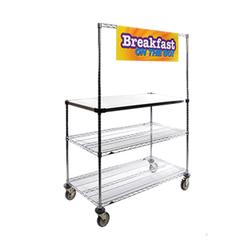 Grab n' Go Breakfast Cart, 36"W x 24"D, (1) solid 304 stainless steel top shelf, (2) chrome wire shelves, (2) 70" chrome posts, (2) 27" chrome posts, hanging rail, double sided signage, (4) 5" swivel stem casters with brakes, NSF