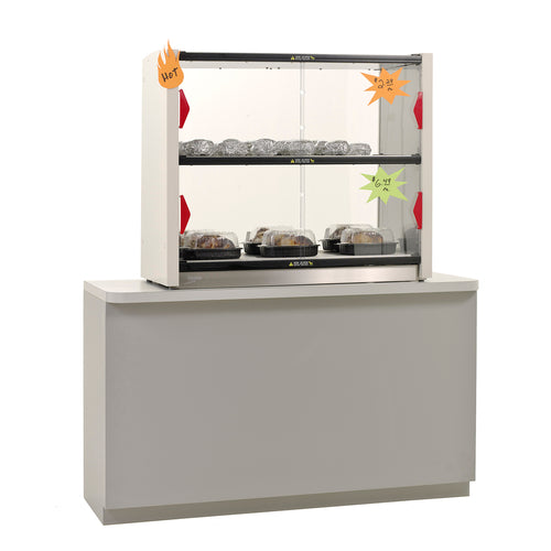 Metro2Go Grab & Go Hot Station, (2) individually controlled stainless steel shelves with sliding front polycarbonate doors, pass-thru, open back, powdercoated side panels, adjustable thermostat to 200°F max temperature, 120v/60/1-ph, 800 watts, 6.7 amps, cord & NEMA 5-15P, NSF, cULus, Made in USA