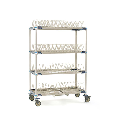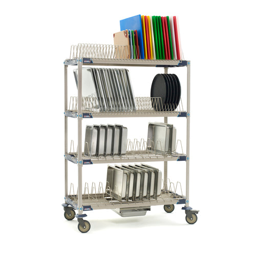 MetroMax® i Mobile Drying Rack Unit with Drip Tray, 48"W x 24"D x 68"H, 4-tier, for trays/cutting boards/sheet pans & steam pans, includes: (4) open shelf frames, (4) 63" mobile posts, (2) cutting board/tray drying racks, (2) pan racks, (1) adjustable drip tray, (4) polymer swivel casters (2 with brakes), built in Microban® antimicrobial product protection, NSF