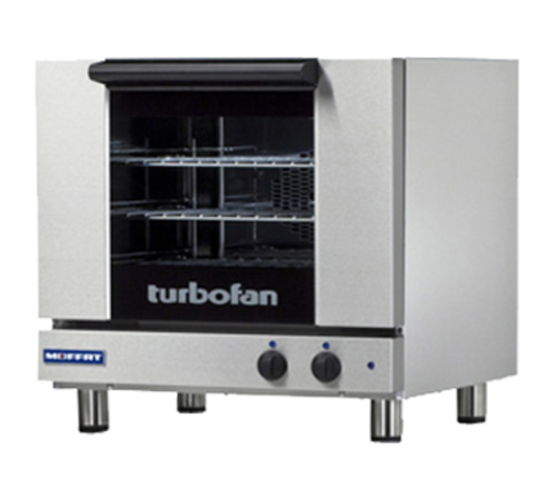 Turbofan® Convection Oven, electric, countertop, 23-7/8" assembled height, (3) 1/2 size sheet pan capacity, 3-1/3" tray spacing, manual controls, mechanical thermostat range 150 - 500° F, 60 minute timer, stainless steel front, sides and top exterior, pull-down twin pane glass door, porcelain interior, 3" adjustable stainless steel feet, cETLus, NSF