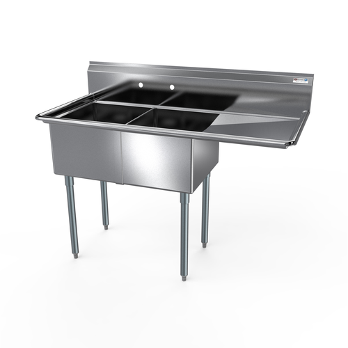 Economy Sink, two-compartment, 56-1/2"W x 23-1/2"D x 43-3/4"H overall size, (2) 18"W x 18" front-to-back x 12" deep compartments, (1) 18" right drainboard, 10"H backsplash with 2" return, (1) set of splash mount faucet holes with 8" centers, 3-1/2" die-stamped drain openings, 18/300 series stainless steel construction, galvanized legs & gussets, adjustable plastic bullet feet, NSF (contact factory for NET pricing information)
