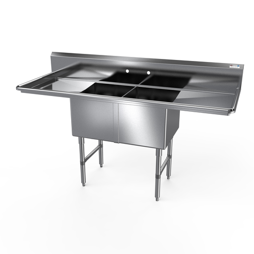 Premium Sink, two-compartment, 75-1/4"W x 23-1/2"D x 44-1/16"H overall size, (2) 18"W x 18" front-to-back x 14" deep compartments, (2) 18" left & right drainboards, 10"H backsplash with 2" return, (1) set of splash mount faucet holes with 8" centers, 3-1/2" die-stamped drain openings, 16/300 series stainless steel construction, stainless steel legs, gussets & bracing, adjustable stainless steel bullet feet, NSF