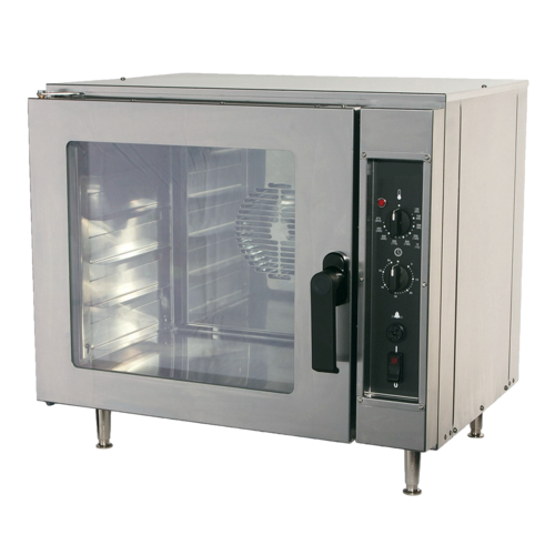 Countertop Convection Oven, (5) half-size pans (13" x 18") capacity, dual pane cool to touch left-hinged glass door, electromechanical controls, thermostat indicator light, 60 minute timer, removable side racks, stainless steel construction, 4" adjustable legs, cETLus, NSF, Made in USA
