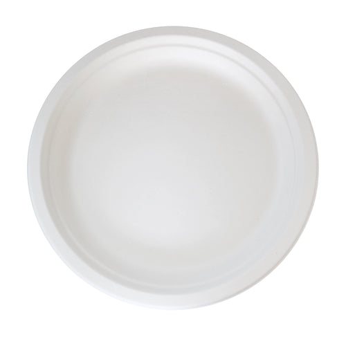 Plate, 10" dia., round, microwavable, grease resistant, freezer safe, reusable, compostable, biodegradable, sugarcane, white, case quantity = 500 (25 each per pack, 20 packs per case)