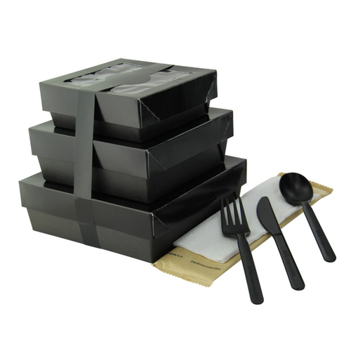 VIP Set, Includes: (5) Bakeable Black Kray Box with PET Lid - 12oz 3.9 x 3.9 x 1.6in Up to 440F(base Only) - 100 pcs (210KRAYBAK115), (5) Bakeable Black Kray Box with PET Lid - 12oz 3.9 x 3.9 x 1.6in Up to 440F(base Only) - 100 pcs (210KRAYBAK135), (5) Bakeable Black Kray Box with PET Lid - 12oz 3.9 x 3.9 x 1.6in Up to 440F(base Only) - 100 pcs (210KRAYBAK155), (1) Black Self-Adhering Paper Wrapper - 15.75in - 500 pcs (210LAP40N), (2) Compostable Black 4/1 Cutlery Kit With Kraft Bag (Knife, Fork, Spoon, Napkin) - 6in - 250 kits (210CVPLK416N)