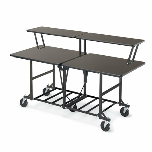Catering Table, fold n' roll design, rectangle, 2-tier, 30"W x 72" L x 30"H, high-pressure laminate surface with Armor-Edge®, black powder coat frame & leg finish, 5" swivel casters, non-marring feet, underneath black storage rack (5% PRODUCT SURCHARGE - SEE NOTES UNDER DETAILS)