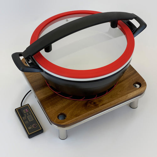 Artisan Chafer Induction Set, includes: (1) Artisan round chafing dish with black handle (1A15901001) (1) Domino medium tray stand (1A19405090) (1) square induction wood platform with magnets (1A19405AWB) (1) induction warmer (1AIW110V2) (1) drop-in ring (1AIW180V2Ring) (1) silicone pad (1A11759) cast aluminum, powder-coated