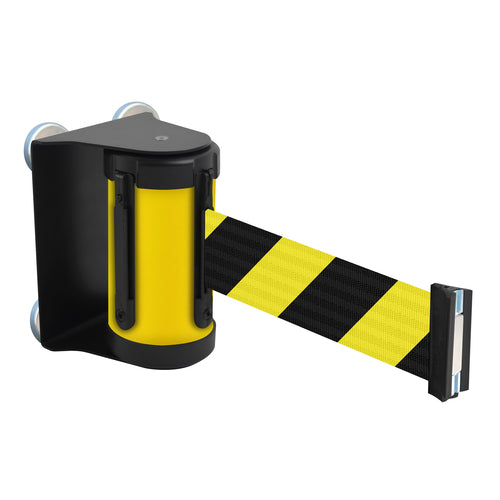 Tensabarrier® Wall Unit, 13'L x 6"W belt, standard wall mount, rotating, for restricting areas without taking up floor space, SlowRetract™ braking mechanism, metal, yellow