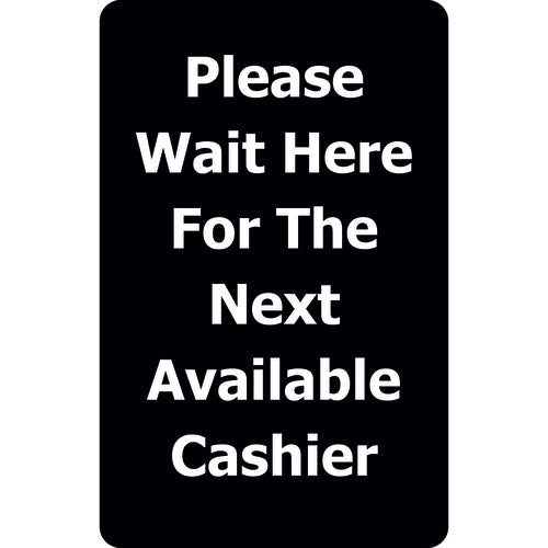 Sign, 11" x 14", 1/4" thick, vertical, single sided, "Please Wait Here For The Next Available Cashier", white letters, acrylic, specify color