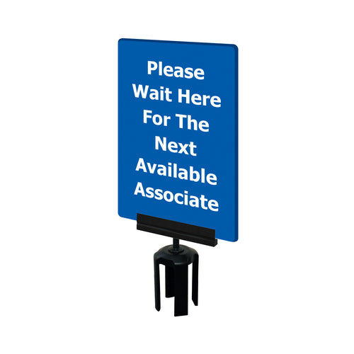 Sign, 8-1/2" x 11", 1/4" thick, vertical, single sided, "Please Wait Here For The Next Available Associate", white letters, acrylic, specify color