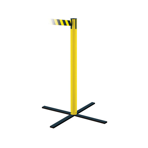Tensabarrier® Stowaway Post, (4) 38"H, 29-1/2" cross base posts, 4-way connectivity, 13'L belt, includes black carrying bag, compact, lightweight, weather resistant, plastic post and base, yellow (ships flat packed)