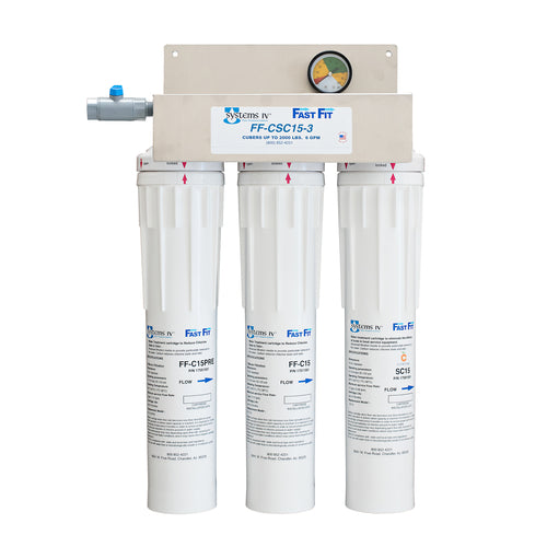 Systems IV® Water Filtration System, (3) unit system, 6.0 gpm, 1 micron sediment reduction, with Citryne® scale elimination, 3/8” FNPT standard connection, Fast-Fit cartridges, pressure line gauge, full port shut off valve