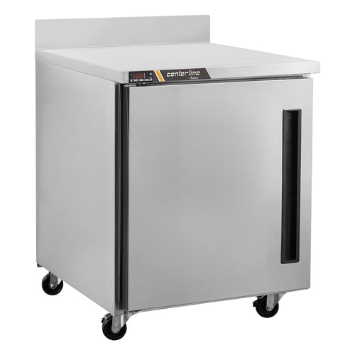 Centerline™ Compact Undercounter Freezer with Work Top, 27" W, 6.5 cu. ft. capacity, self-contained rear-mount refrigeration, (1) right hinged solid door (field reversible), electronic control with LED display, (2) epoxy coated shelves per section, 4" backsplash, stainless steel exterior, anodized aluminum interior, (4) casters, R448A refrigerant, 1/2 HP, 115v/60/1-ph, 4.0 amps, NEMA 5-15P plug, cETLus, ETL-Sanitation