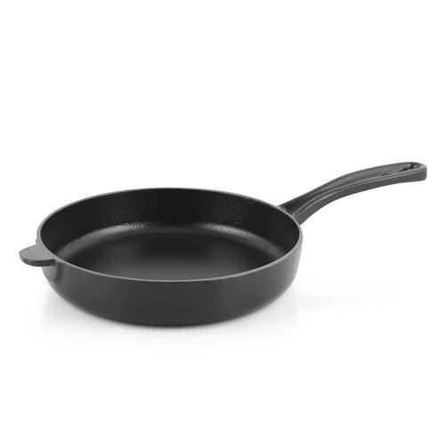 Pan, 11" dia., round, flat, with helper handle, stovetop/gas/induction/oven/dishwasher safe, enameled cast iron, black