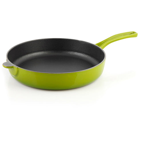 Pan, 11" dia., round, flat, with helper handle, stovetop/gas/induction/oven/dishwasher safe, enameled cast iron, green