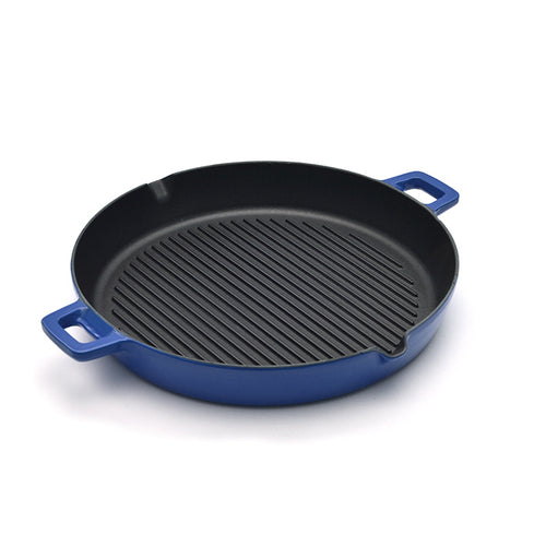 Grill Pan, 2-3/5 qt., 11-7/8" dia., round, dual side handles, stovetop/gas/induction/oven/dishwasher safe, enameled cast iron, cobalt blue