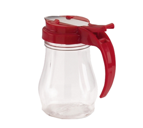 Dripcut® Syrup Server, 7 oz., clear polycarbonate jar with red plastic top, 4-1/4"H (10.8cm), 2-3/4" (7cm) bottom diameter, 1-3/4" (4.5cm) jar opening, Made in USA (priced by each, packed (12) per case, cannot break case), made to order, cannot be cancelled or returned