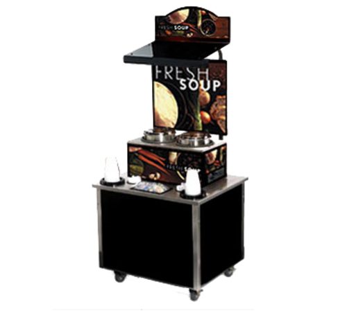 Cayenne® Soup Kiosk-free standing Merchandiser with Tuscan graphics, Black Laminate 4-Series Signature Server® with Stainless Steel Countertops, base TSM-27, menu board & canopy with light, storage on front or back of base, hinged door with lock, HD stainless countertop, self-leveling dispensers for cups/bowls, 6" deep pan for napkinstainless steelpoons, single cord & plug, 4" locking casters, 34"L x 28"W x 78"H, UL, NSF, Made in USA